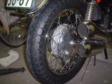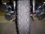 タイヤ・ホイールの取り外し アクスルナットを緩め、スイングアーム端部のチェーンアジャスタの ストッパーボルトを取り外すと、マフラーを外すことなくホイルの脱着 が可能である。便利だ・・・ 当然トルクロット、ブレーキロットは外しておくこと。 チェーンの取り回しに気をつけて、知恵の輪気分で取り外します。 |