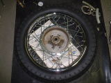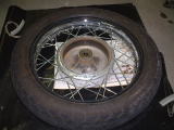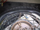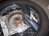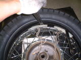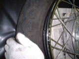 タイヤの取付けA チューブのバルブをホイールの穴に仮止めしておきます。 次に片側のビートを入れますが、まず、バルブの反対側の ビートから入れていきます。 (このときはまだ軽い・・・) |