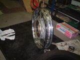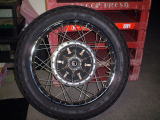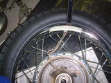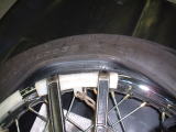 タイヤの取付け@ リムにリムバンドを取付けます。 リムにタイヤを乗せて、写真で見ると手前側のビートは 入るところまで入れておきます。 残り部分をレバーでこじ入れます。 |