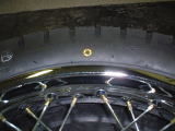 片側のビートが入った時点で、タイヤの軽点(黄色いマーク)を バルブ穴(一番重くなる位置)に合わせます。 次にチューブを入れ、手探りでねじれ等ないか確認しておきます。 |