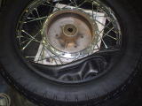 タイヤの取付けB 半分ほど入れた地点で、膝でタイヤを押さえ込み 残りの部分に取り掛かります。 結構ここも「気合と根性で(`・ω・´)」ギュー! |